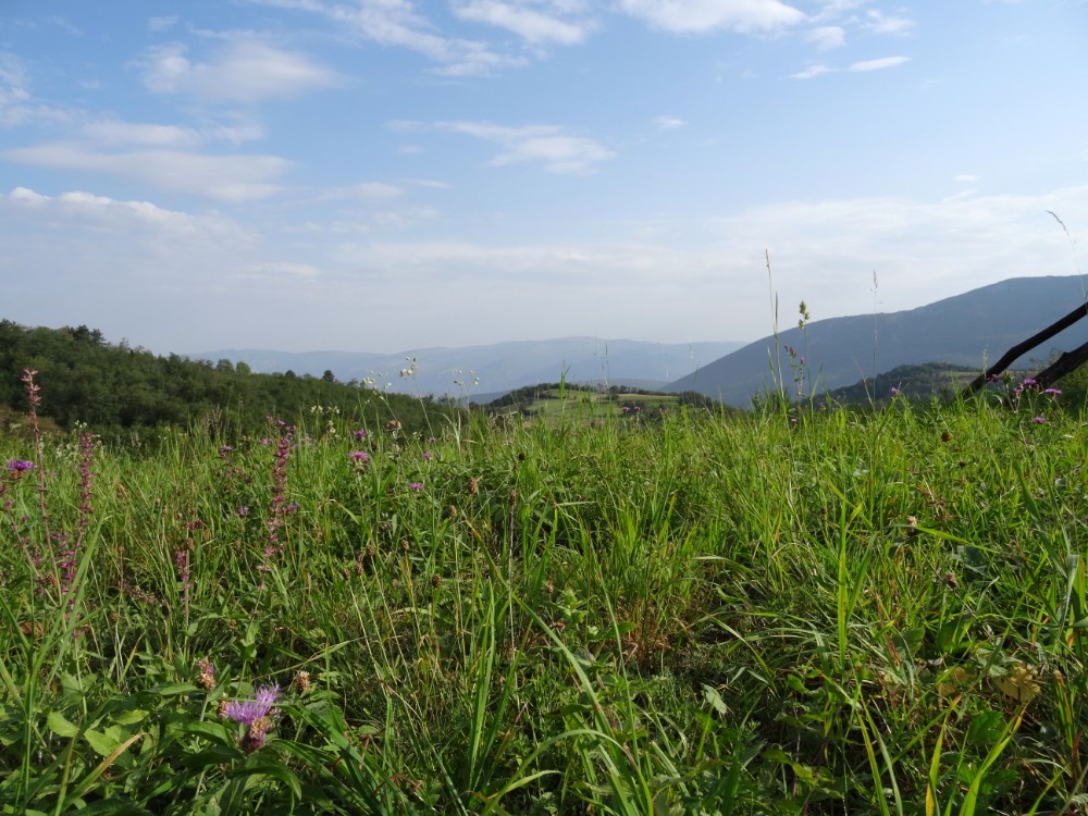 Onze bus brengt ons tot Gornja Studena, waar de buschauffeur ons nastaart als wij de weg vervolgen de bergen in. Meteen hebben we gezelschap, want er loopt een hond met ons mee. We stijgen flink. Wolken worden steeds zwaarder en het wordt benauwd als we het berggebied Suva Planina binnengaan. De liters water die we meezeulen vliegen er doorheen. Niet erg, want het bergwater kun je zo drinken. Langs de weg zijn veel aangelegde waterbronnen te vinden. We lunchen met een schitterend uitzicht over het dal, waar in de verte ons verblijf van de nacht ervoor ligt. Het is een skigebied dat ‘s winters vooral door Serviërs wordt bezocht. Vele malen zijn wij dankbaar voor de gps-coördinaten, want de bewegwijzering is zeer summier.